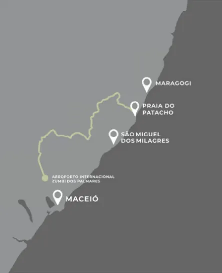 Estrada litorânea com paisagens incríveis, ideal para quem busca um trajeto tranquilo, com paradas em praias como Japaratinga, Porto de Pedras e Toque.